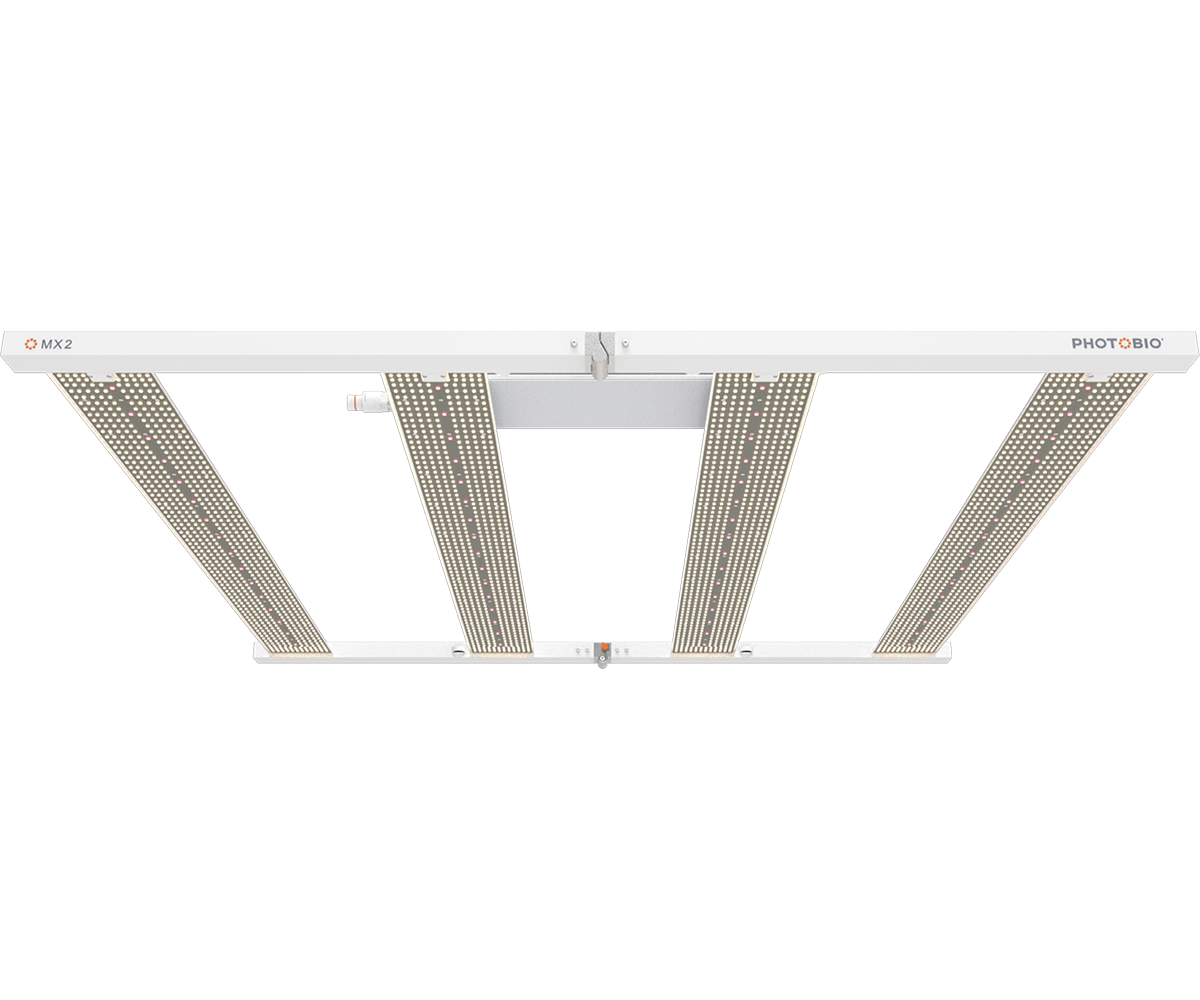 The PHOTOBIO•MX2 changes everything, again. The best-selling PHOTOBIO MX fixture evolves with higher output and better efficiencies while still delivering the same great recipe many growers have come to love. We care about you and your crops. We know nothing will stop you from focusing on the goal and trying to do better. Photobio has similar beliefs, to always try to raise the bar and be BETTER. The result is a 1,870 uMol/s (PAR) fixture that consumes the same power as the original MX while delivering enhanced efficacy at 2.8 uMol/J. The PHOTOBIO MX2 offers 10% more photon output, 10% better efficiency and a 47% weight reduction compared to the original model. The wide light bars deliver the uniformity and intensity that professional growers desire. Increase yields while driving down operational cost with the PHOTOBIO MX2.